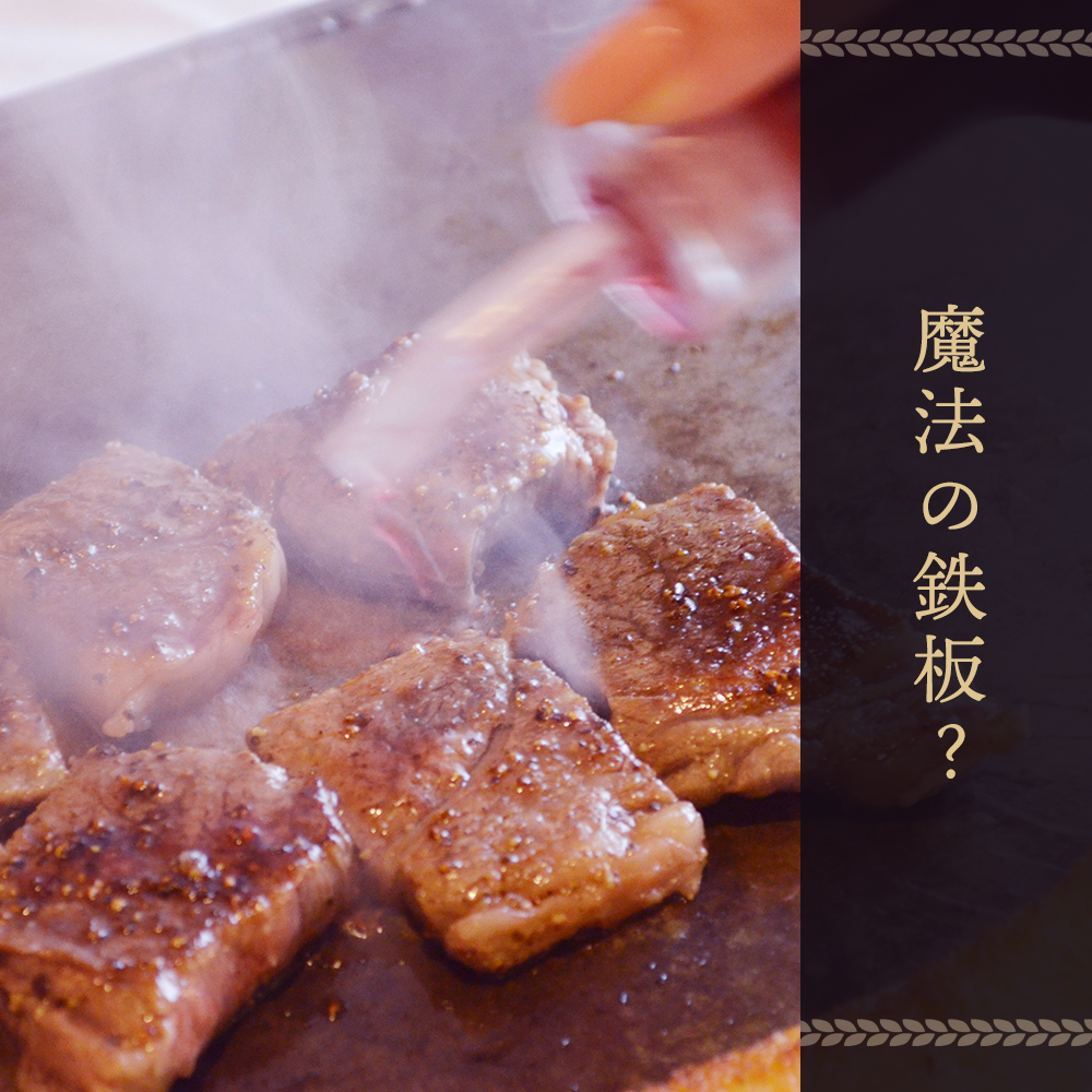 テーブルクロスの上に鉄板が置いてあり、その鉄板でステーキを焼く!なぜ熱くなるの?初めてのお客様は声をそろえて言って頂きます(笑)火を使っていないので、火傷などの心配も軽減されます。不思議な鉄板で、目の前で焼く神戸牛は自慢の逸品です!